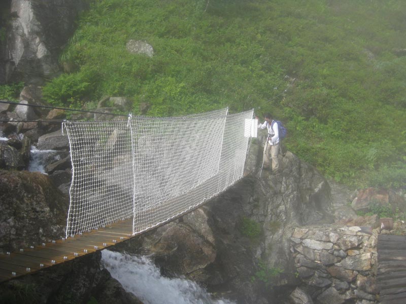 Arrivés dans le vallon, les nuages bas et le brouillard limitent toute visibilité. Nous remarquons, seulement, le réservoir d’eau circulaire, alimentant les villages proches. Une passerelle, étroite, suspendue à des câbles, nous invite à traverser le torrent. Soleil et brumes, forment un halo, avec arc en ciel, comme la formation du spectre de Brocken.