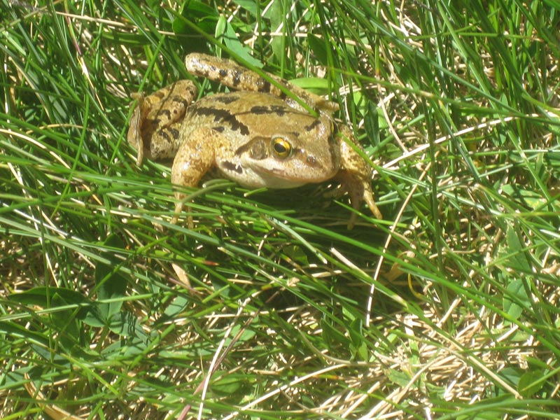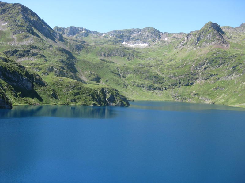 Une grenouille nous observe, circonspecte. Nous nous installons pour déjeuner, au bord de ce joyau d’émeraude qui scintille dans les éclats des rayons du soleil, enflamment sa surface limpide. Les sommets exposent leur relief. Soum de Moutarra, pic Merleu, Pène Det Pouri, se détachent dans le bleu du ciel.