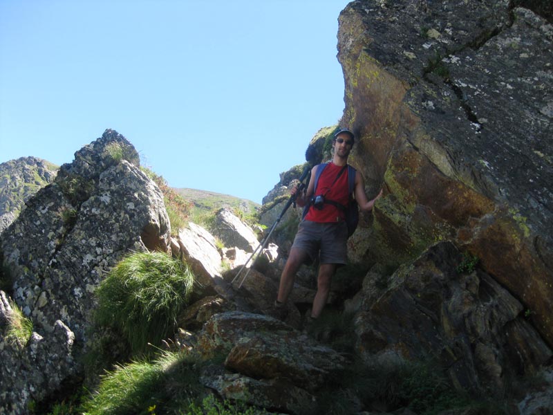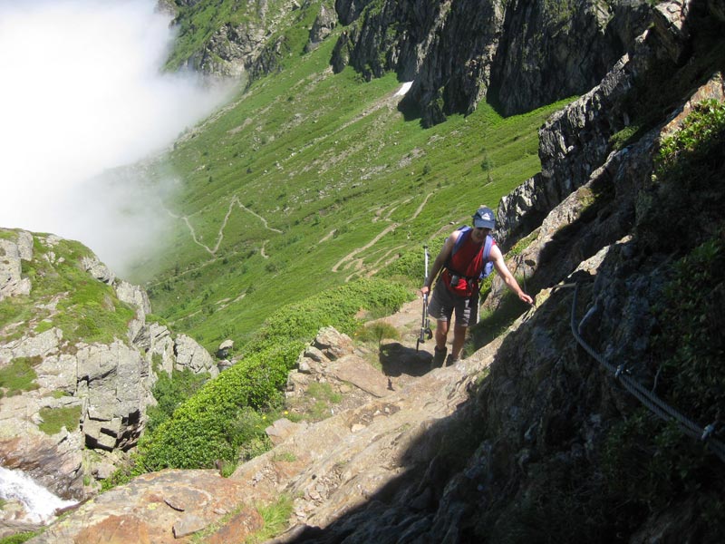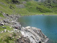 Nous poursuivons la progression, par des rochers abrupts, équipés de câbles de sécurité. Nous évoluons dans les prairies, côtoyant un petit lac, puis passant un collu, pour redescendre sur le lac Vert.