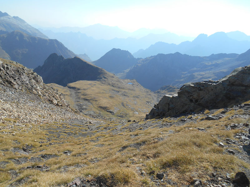 Nous repartons le long de la crête en direction de l'est, sur un col. Avec une partie du groupe, nous grimpons à la Hourquette d'Arre, que nous atteignons en un quart d'heure. Nous dominons les lacs d'Uzious et du Lavedan.