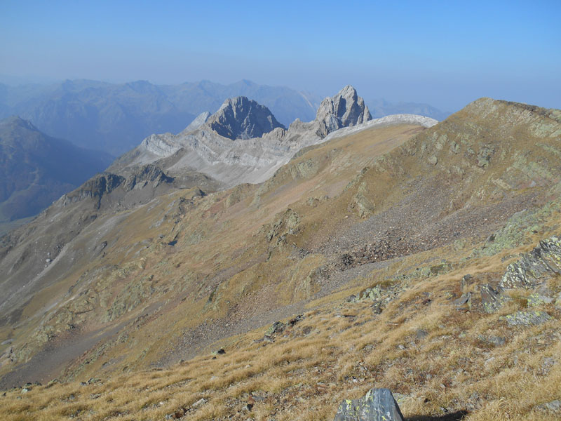 Contournant les ruines des mines de fer et laissant le pic d'Anglas, au sud, dominé par la Géougue d'Arre, le cheminement grimpe dans un pierrier. Il continue par une crête aérienne, suffisamment large. Autour de nous les paysages se découvrent. Nous atteignons Arre Sourins, à midi. Vignemale, Balaïtous, Arriel, Lurien, Ossau, Aspe, Ger, Latte de Bazin, Gabizos, Bécotte, Sanctus, et autres, nous entraînent dans une ronde sans fin. Éblouis par le spectacle, nous déjeunons au sommet.