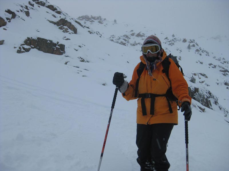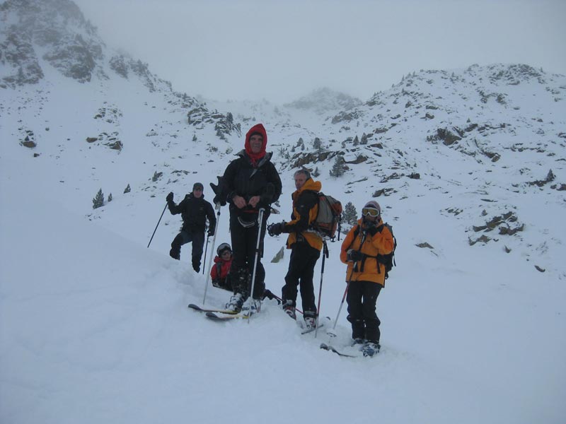 Nous descendons au col, rejoindre les filles, qui nous attendent pour la grande descente, à l'aveuglette. Après le passage de la corniche nous rencontrons quelques passages gelés, qui impliquent des dérapages.