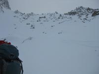 Nous prenons un couloir raide avec passage d'une corniche. Les conversions s'enchaînent et nous parvenons sur un col. Nous attaquons la dernière pente, raide et gelée. A 13 h, nous atteignons, une des pointes de la crête. Mais le relief est toujours bouché.