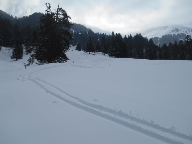 Puis nous nous lançons dans la descente, le long de la crête encore gelée. Ensuite, nous basculons au Nord, dans une pente raide. La neige est meilleure. Nous naviguons entre les sapins, choisissant les passages les plus adaptés, entre bosses et creux, arbustes et ruisseaux.