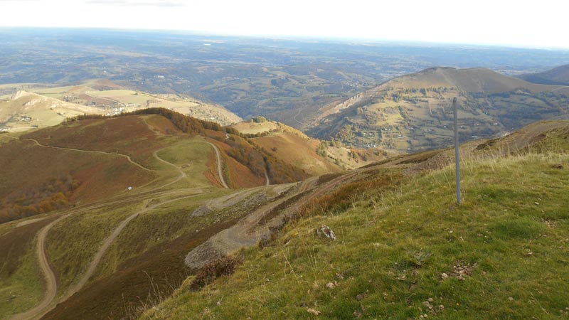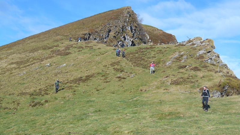 De vallons en crêtes, sous le regard de troupeaux de vaches, nous évoluons dans les secteurs Séras et Gargarède, sous la crête Courades de Bazust. Nous traversons le col de Tos ( 1450 m.) fermé par du fil de fer barbelé. Du secteur Le Couret, nous filons vers le sud-est, longeant une crête, pour atteindre le Cuq Crémail, à 10 h 30. Le paysage est très ouvert. Nous remarquons Tarbes, Lourdes, Pau, Lannemezan et les petits villages. En face, au sud, domine le Montaigu, saupoudré de neige.