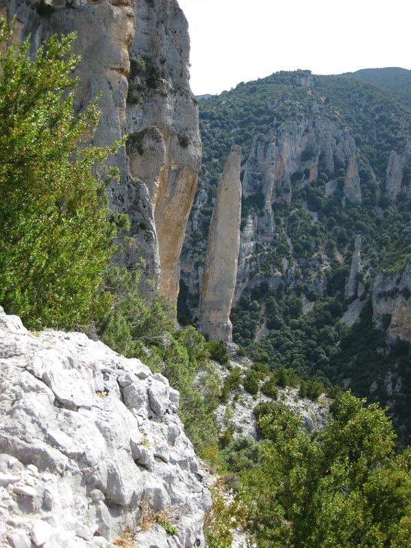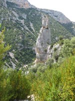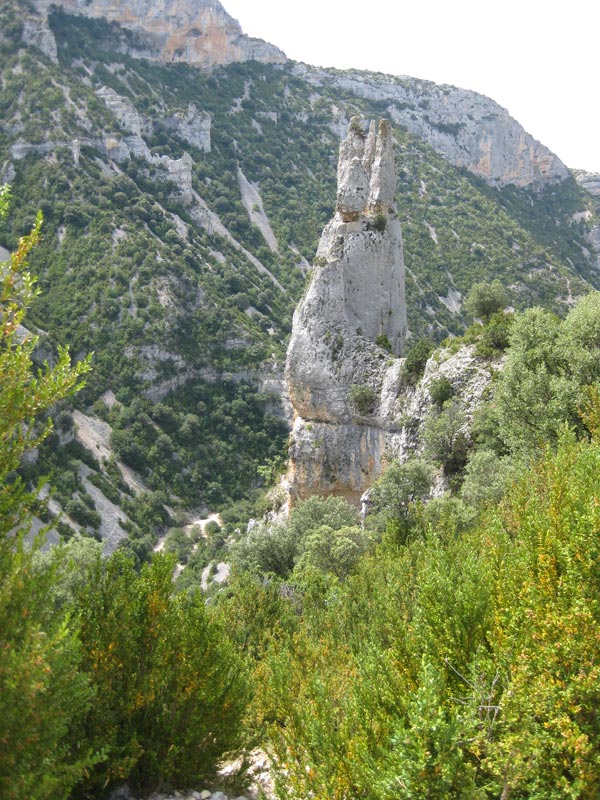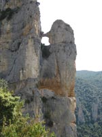 Malgré un orteil douloureux, j’ai hâte de revoir, les étranges rochers de ces lieux magiques. Le Dauphin, perché dans la montagne, salue le peuple des randonneurs et escaladeurs. Au loin, la Cuca Bellostas, nous indique la direction, en pointant sa pique. Longeant le rio, puis le traversant, nous le quittons dans les fourrés. Cairn et panneau, nous invitent à gravir l’impressionnante Citadelle, monstre géant et pacifique de ces lieux, où nichent les vautours. Portes et fenêtres s’ouvrant vers le ciel, creusées dans le rocher puissant, permettent aux êtres étranges de s’évader vers l’inconnu.