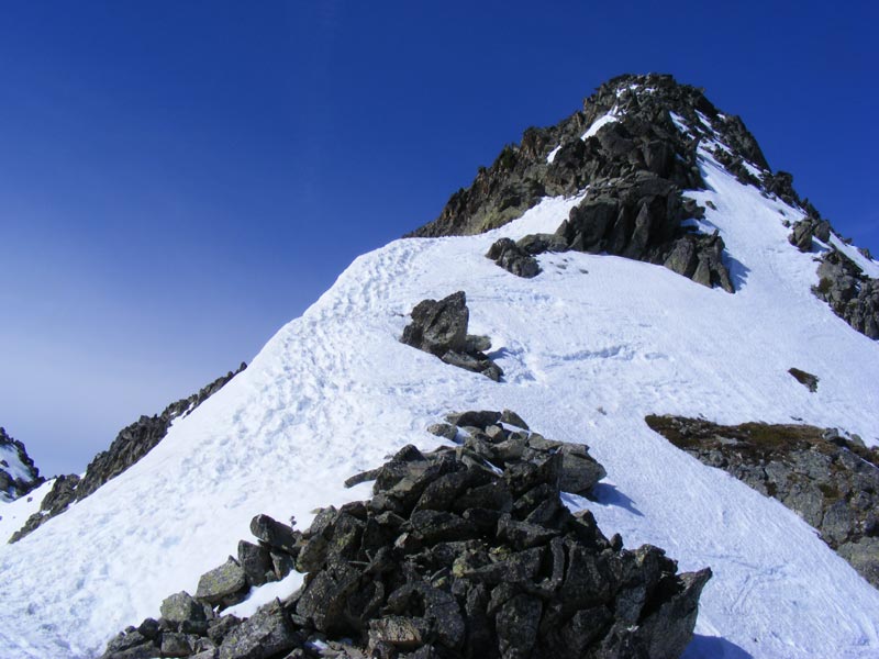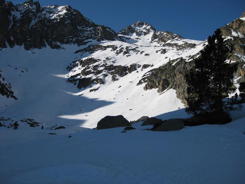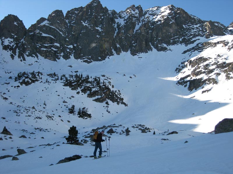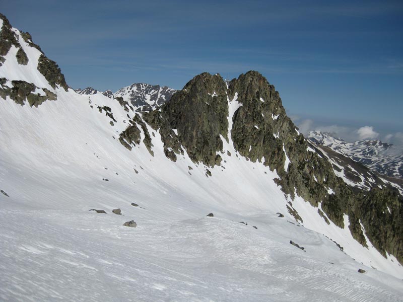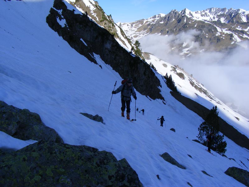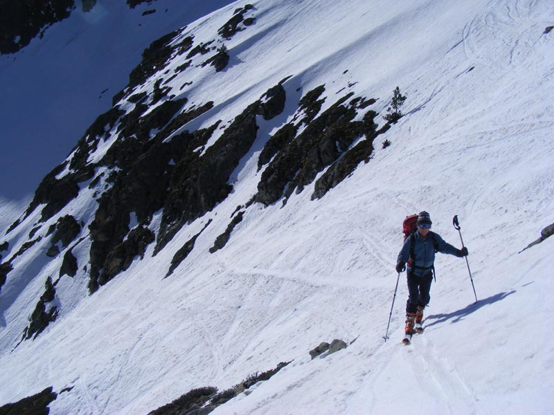 Le lever est très tôt, 4h40, pour rejoindre Yves à Odos. Nous arrivons à La Mongie vers 7h40. Nous portons un quart d’heure les skis et posons les couteaux car la neige est gelée. Après la montée de trois pentes raides espacées par des vallons, nous remarquons, face à nous, la crête de Pêne Nègre, que nous avions escaladé, jadis. Dépassant la Coume de Porteilh, nous remontons la quatrième pente, encore plus raide, qui nous mène sur un col. Crampons aux pieds, nous gravissons le pic des Quatre Termes. Saisit par des crampes, je m’arête un peu avant.