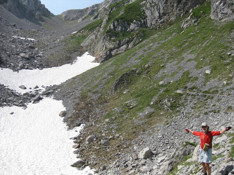 Nous basculons vers cette destination et remontons le pierrier raide traversé par des névés. A 12h20, nous atteignons le col de Laraille. Nous suivons la crête ouest, puis une sente taillée dans la falaise, versant espagnol. Nous sommes allé un peu trop loin, nous revenons sur nos pas pour retrouver un cairn indiquant le passage d'une cheminée de plusieurs mètres qui sort sur une arête fine. L'arête file à l'ouest et nous transporte sur le pic de Laraille, à 13h 15.