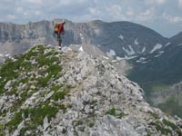 Nous repartons sur l'arête aérienne et désescaladons la cheminée. La suite est plus paisible, la crête étant plus large. Nous déjeunons sous le col. Le ciel se couvre.