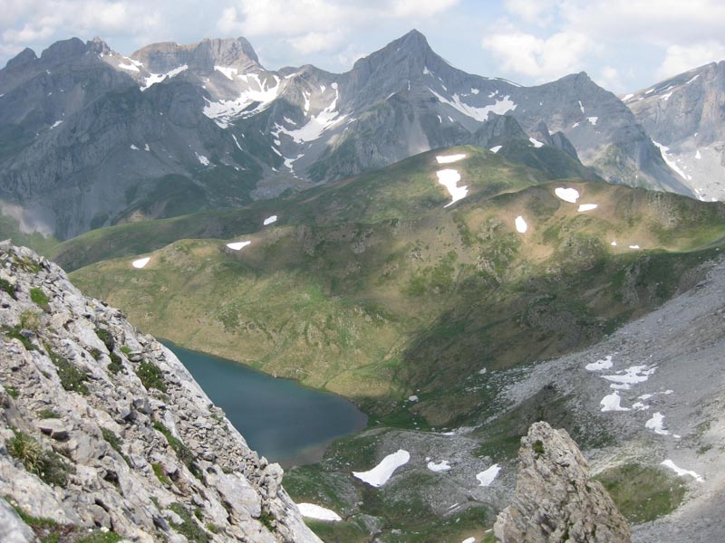 Un immense vallon herbeux, au sud, se heurte à une muraille de massifs. Les hauts sommets sont noyés dans les nuages, comme les flancs du pic du Lac de La Chourique plongeant dans le lac ou Ibon de Acherito. Pic des Trois Rois, Dec de Lhurs, pic d'Anie dominent à l'ouest.