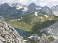 Nous devons tenter le pic Lariste par un passage qui n'est plus signalé, sur les cartes récentes. Nous longeons un bois séparé par un ruisseau. Puis nous débouchons, sur un vallon, dans un cirque présentant des murailles énormes et infranchissables. A première vue nous ne sommes pas du tout dans la bonne direction. Nous grimpons sur une haute butte et repérons un autre vallon. Je reconnais la direction de Laraille et son long pierrier.