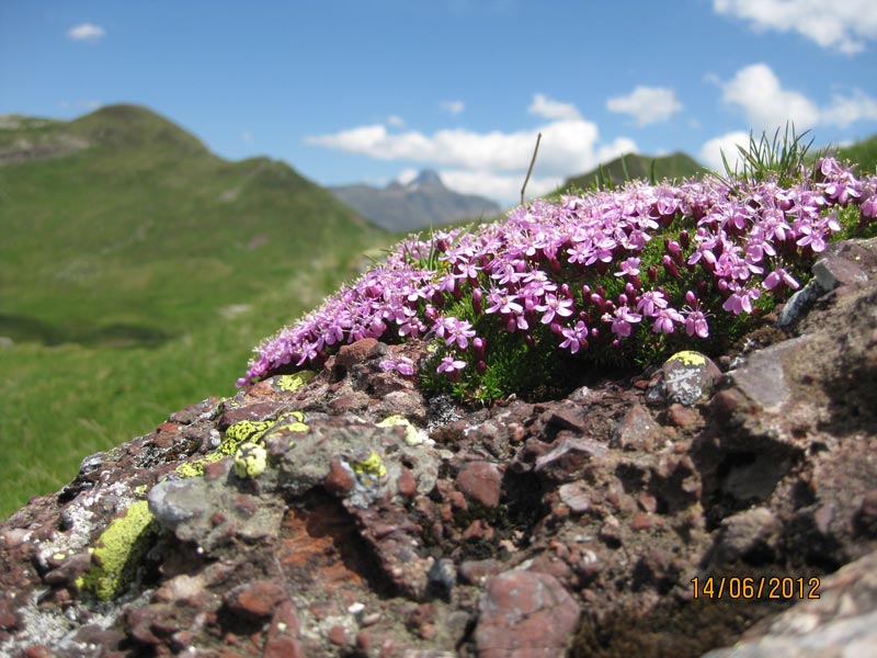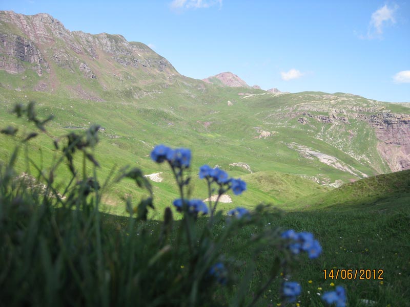 Nous traversons à flanc de montagne et grimpons un couloir herbeux et de pierres, plutôt raide, pour parvenir sur un col à 2127 m. Le vent est encore très fort. Nous suivons la crête sur notre gauche, escaladons les rochers qui nous entraînent sur la crête et atteignons le pic d’Arlet. Un point de vue panoramique, nous présente le plateau d’Aygue Torte, au sud, le pic Visaurin et le cirque d’Ansabère, à l’ouest.