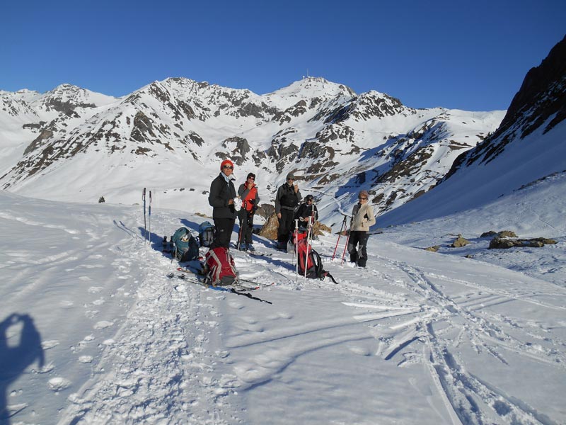 La partie plate, rocheuse et ensoleillée du vallon, permet une pause repas, agréable. Après cette remise en forme, nous nous élançons à la suite d'Edmond, puis d'Eliane qui semblent avaler les pentes, sans être rassasiés. Ainsi nous tressons des lacets, comme de longs fils de neige scintillant de blanc et d'argent.