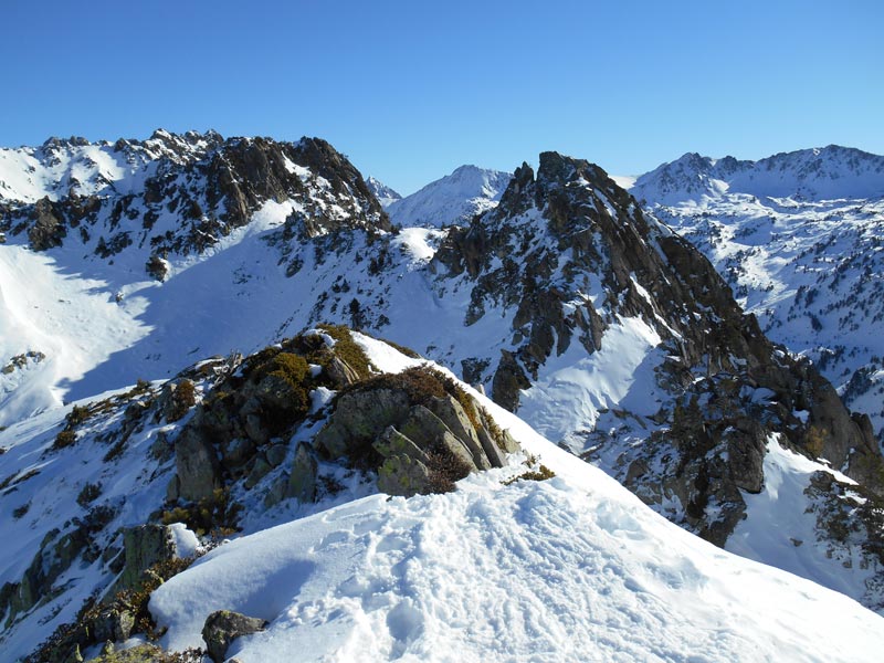 J'effectue la trace et multiplie les conversions, jusqu'à rejoindre le couloir, qui débouche sur un petit col.Suivant la crête à l'Est, nous sommes déposés sur la pointe sommitale de la crête de La Pègue. Il est 12h40. Le panorama est superbe. Au sud défilent le lac Dets Coubous, dans un linceul blanc, les pics de la Mourèle, Dets Coubous, de Madamète, pour les plus connus. Le pic du Midi de Bigorre, grand frère du Montaigu, impose sa présence, au nord.