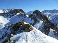 Les cimes découpent leurs ombres colorées et lancent un appel irrésistible, comme les sirènes à Ulysse, sans l'intention de nous égarer.Longeant les flanc du pic de Caoubère, nous empruntons un passage inhabituel, mais qui paraît plus enneigé que le couloir, à l'est, dont nous devinons les rochers en guise de pièges.