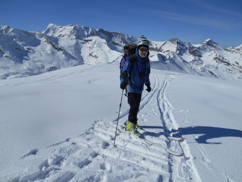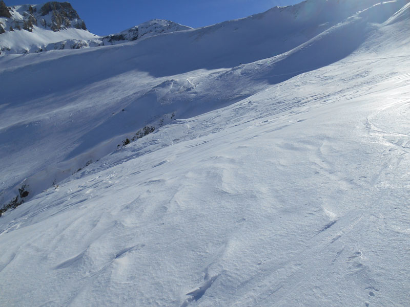 Parvenus dans le vallon, le ski s'avère plus difficile. La neige est cartonnée et même croûtée. Nous repérons un rocher pour déjeuner. Il est 13 45. Le vent fini par nous geler. Nous poursuivons la descente et cherchons les passages les moins raides et les moins exposées. Nous voulons rester en arrière des plaques à vent.