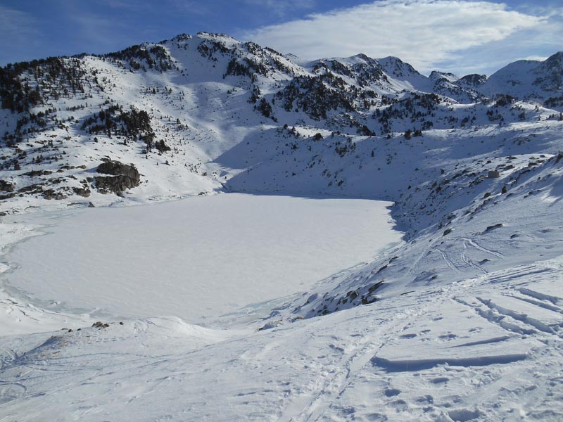 Les couteaux sous les skis, nous affrontons l'immense mur de neige, où chacun cherche sa trace, pour une montée rude. C'est ainsi que nous débouchons sur le vallon Dets Coubous et son immense lac glacé (2041 m.). Nous ne remarquons pas les lacs Déra Yunco, Jonquère, Blanc, ou de Tracens, enfouis sous la neige.