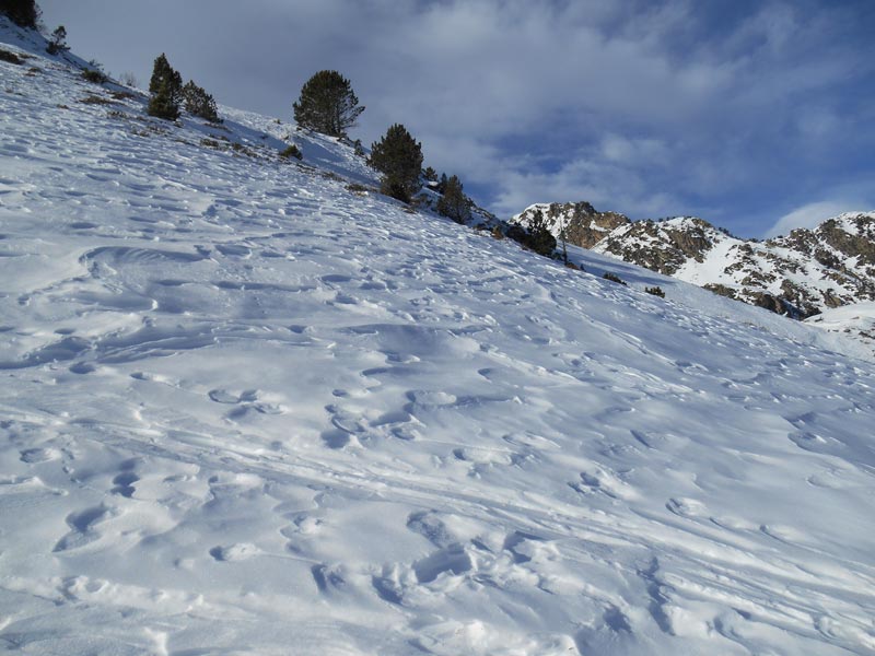 Nous plongeons dans la descente. Les virages s'enchaînent dans une bonne neige, mais celle-ci se transforme en neige gelée et croûtée dans le mur abrupt. Au prix de nombreux efforts, nous parvenons sur le barrage, puis la cabane Dets Coubous. Protégés du vent, contre le mur, nous avalons notre repas. Le ciel se noircit au nord-ouest.