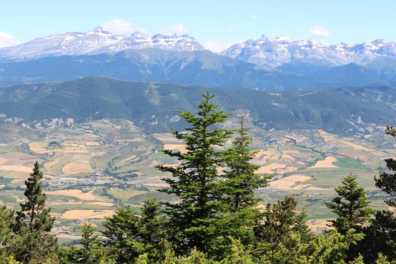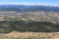 À 10 h, sous un beau ciel bleu, ensoleillé, nous montons par le sentier dans la forêt. Le rythme est lent.Lorsque nous parvenons au croisement des chemins, nous descendons à la Cueva. Nous y parvenons en trois quart d'heure. La voûte de l'excavation s'est écroulée. Nous ne pouvons plus y accéder. La remontée sur la crête est à l'épreuve de la chaleur.Le paysage est splendide. La plaine immense présente Jaca et ses bâtisses, la végétation et les Pyrénées saupoudrée de blanc.