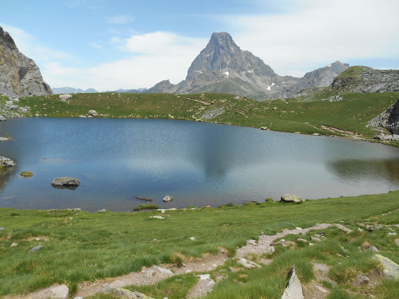 Nous laissons les nuages dans la vallée. Lorsque nous arrivons à Bious-Artigues, c'est un beau soleil qui nous accueille dans des brumes bleutées. La température est douce. Il est 8 h 45, nous marchons sur la piste sud, qui nous entraîne au Pont de Bious, où nous bifurquons à l'ouest, par le GR10. Le sentier passe sous la cabane du Col Long d'Ayous, puis s'approche du lac Roumassot aux eaux lisses, colorées de bleu. Nous laissons le lac de Miey, encore endormi dans le creux des rochers. L'immense lac Gentau sert de miroir au majestueux pic de Midi d'Ossau. Le joli refuge d'Ayous se présente comme le gardien des lieux et nous marquons une courte pause, parmi les parterres de fleurs, rhododendrons, Joubarbes et autres Hélianthèmes.