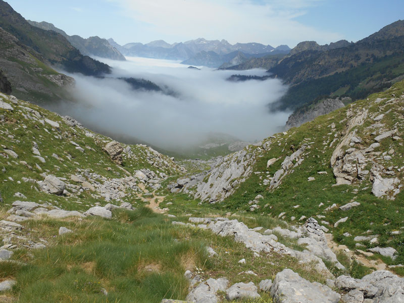 Après ce bain revigorant, nous poursuivons le long retour, passant près les cabanes de La Hosse, puis celle de Cap de Pount. Une mer de nuages semble reculer à notre approche. Passant le pont de Bious, nous filons, dépassant quelques groupes de randonneurs. Nous parvenons au parking enveloppé de brume à 16 h50. La randonnée fut originale et sportive en passant du pic au bain.s