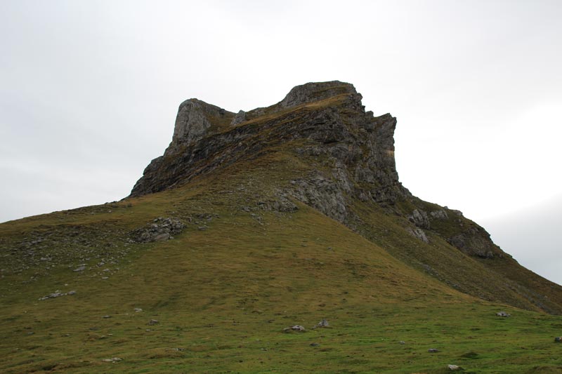 Après une courte pause, nous repartons vers le sud, passant sous le pic de Larry et Las Tres Pundettes de Larry, et nous longeons le lac Bersau. Le sentier s'élève raide, entre les parois et les plans herbeux du pic Castérau que nous atteignons à 11 h 30. Le sommet est une plate forme herbeuse, avec au sud, des parois verticales. Tout autour de nous défilent les cimes de l'Espagne, à la vallée d'Aspe.