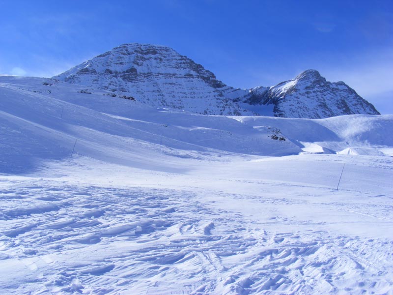 Nous tentons le passage d’une goulotte étroite. La neige, très mauvaise à skier, croûtée, rend périlleux la descente. Nous réussissons à sortir par une pente plus large et suffisamment skiable. Nous parvenons sur les pistes de ski, dont une piste rouge, par laquelle nous descendons avec aisance et sécurité, puis rejoignons la piste qui nous transporte au bas de la station à 14h20. Le vent souffle toujours le ciel se couvre de plus en plus, nous pouvons mettre les voiles pour une destination plus douce, en température.
