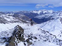 Nous nous lançons dans la montée du col des Especières ou Port Vieux (2334m). Equipés des couteaux, posés sous les skis, nous affrontons la crête ventée et glacée. Le passage délicat de rochers me contraint à déchausser. Parvenus sur un replat étroit, nous chaussons les crampons à glace, ainsi nous atteignons le Pic Entre Les Ports, à 12h 20. Nous continuons à avancer sur l’arête, je n’y voit rien et m’arrête pour mettre le masque de ski. Je repars avec une contraction de la jambe blessée. Yves est déjà loin, je ne peux le rattraper, il a atteint le second sommet et revient.