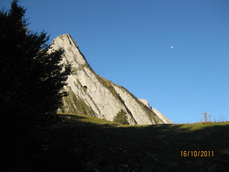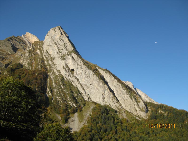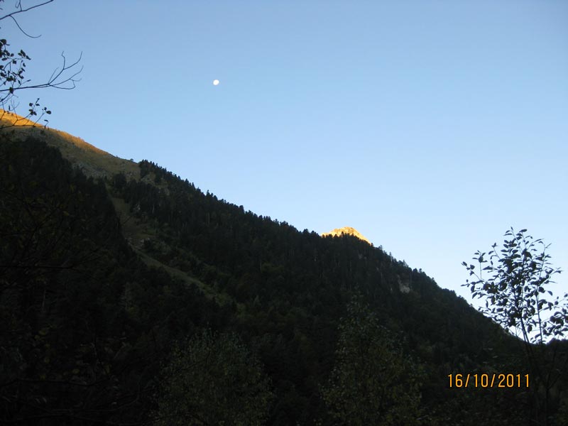 Nous prenons la route à 7 h, avec Frédéric, pour la vallée d’Ossau et nous parvenons aux gorges du Bitet ; Cette fois-ci, nous prenons la direction d’Iseye et traversons le bois. La lune se déplace dans le ciel bleu.quand, soudain, proche, un sommet s’enflamme, annonçant le renouveau d’un bel aurore La montagne se transforme en une gigantesque fresque peignant des formes par ses couleurs, colorant ses contours par ses formes.