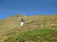 Nous bifurquons, sur notre droite, avant la cabane Laiterine, vers la crête de Cotcharas. Je grimpe tout droit, sur les pentes herbeuses, très raides. Le ciel bleu sert de miroir aux rayons du disque solaire et la chaleur s’amplifie Le relief en montagne est toujours un piège. De larges creux ou plates-formes s’incrustent dans la pente et ne peuvent être deviné du bas.