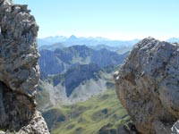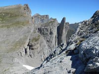 Le passage s'accroche sur les rochers et une arête qui s'affine. Se présente, alors, une cheminée étroite, exposée au vide. Je m'engage dans l'ascension et de fil en aiguille parviens au sommet, à 12 h 15. Le spectacle est impressionnant. Les Aiguilles d'Ansabère, immenses piliers rocheux, crèvent l'azur.