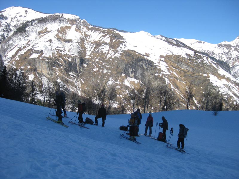 A nouveau nous pénétrons dans le bois, pour parvenir à La Chaussette, long couloir pentu et enneigé, qui prend la forme de ce vêtement. La remontée de la Chaussette dans une neige gelée, est parsemée de charnières et de bosses, rendant périlleux l'ascension, imposant les couteaux sous les skis.