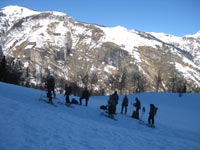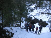 Après les cabanes de Laga de Haut et Laga de Baigt,submergées de neige, nous pénétrons dans le bois, sur le sentier du Gourzy qui nous amène, souvent, de façon acrobatique, derrière le Casino des Eaux Bonnes. Il est 17 h, nous sommes satisfaits, tout le monde a suivi, malgré, les imprévus de cette course.