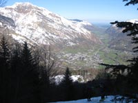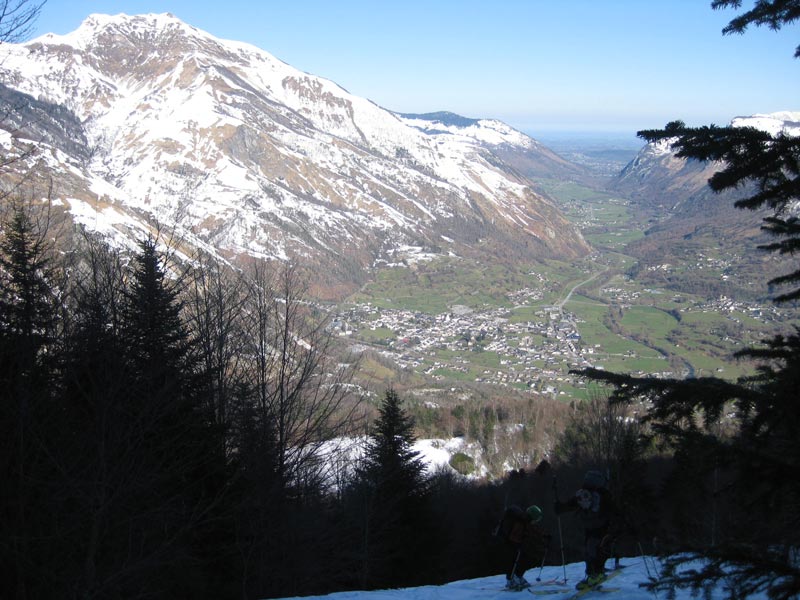 Le chemin forestier nous entraîne dans des passages entre les arbres et les branches et nous oblige à déchausser par endroit. Le petit Plateau de Gélos atteint, nous pouvons admirer, en bas, au nord, Laruns et la vallée qui s'ouvre vers la plaine d'Arudy.