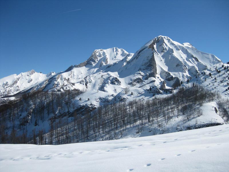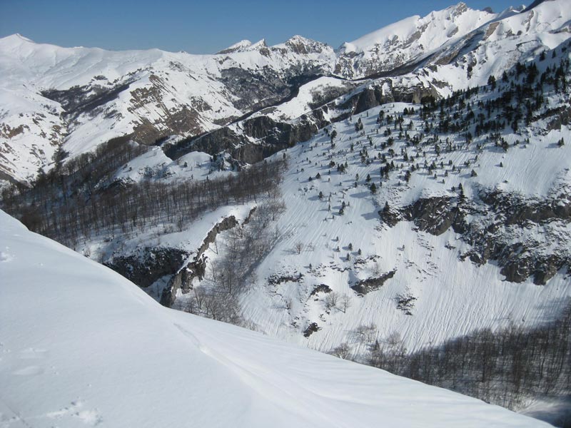 Nous débouchons sur un vallon, enfin exposé au soleil, sous une voûte d'azur. C'est la direction du Gourzy et nous suivons la crête, face au Montcouge, au Pambassibé et au pic de Gers. C'est splendide !