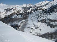 Un arrêt, vers 14 h, nous permet de nous alimenter, à 1720 m. Comme nous préférons éviter le retour par les passages de la montée, nous optons pour le circuit de la Chaussette, en boucle. Il s'agit, au départ de franchir la corniche, puis de plonger dans le profond vallon, pentu, de Gourziette.