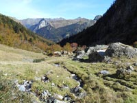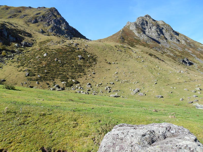 Je contourne le lac et grimpe dans la forêt. Plus tard, je débouche sur un long vallon, qui commence à s'ensoleiller. Le sentier passe au-dessus d'un gros rocher et longe, plus loin, le ruisseau d'Aas. Je tente un circuit, plus au nord.Comme il s'éloigne trop du col, je reviens dans le couloir raide et grimpe dans les rhododendrons et les rochers, jusqu'à atteindre le col d'Aas de Bielle.