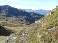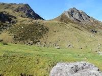 Je cherche le passage de descente, alors qu'un petit groupe de randonneurs arrive. Au jugé, j'affronte les pentes herbeuses raides, par les parties les moins exposées. Arrivé sur le petit plateau d'Arrouyes, je remarque les larges lacets qui s'élèvent vers le col de la Hourquette de Larry. Passant le ruisseau, je monte droit vers le col. De l'autre coté défilent les cimes de la vallée d'Aspe: pic Baralet, montagne de Couecq, etc.