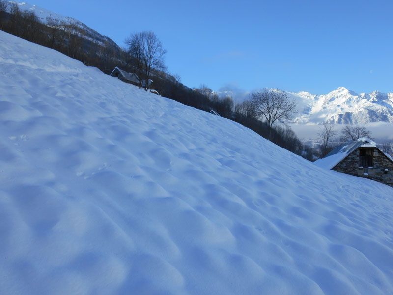 Vers 13 h 30, nous nous lançons dans la descente. Légèrement poudreuse, la neige nous invite à exprimer nos différentes techniques, même les plus insolites. Jusqu'à la cabane de Betpouey, nous pouvons jouer sur les skis avec le relief. Mais la neige change de texture, cartonnée, avec une croûte gelée, ou glacée par endroit.