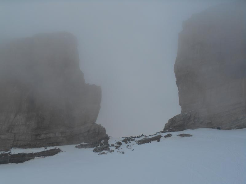 Nous abordons le glacier raide, mais en bonne neige. Parvenus sur un replat, sous la Brèche de Roland, nous décidons d'arrêter la randonnée, par manque de visibilité. Il est 11 h 30. Nous rencontrons un groupe du Caf.