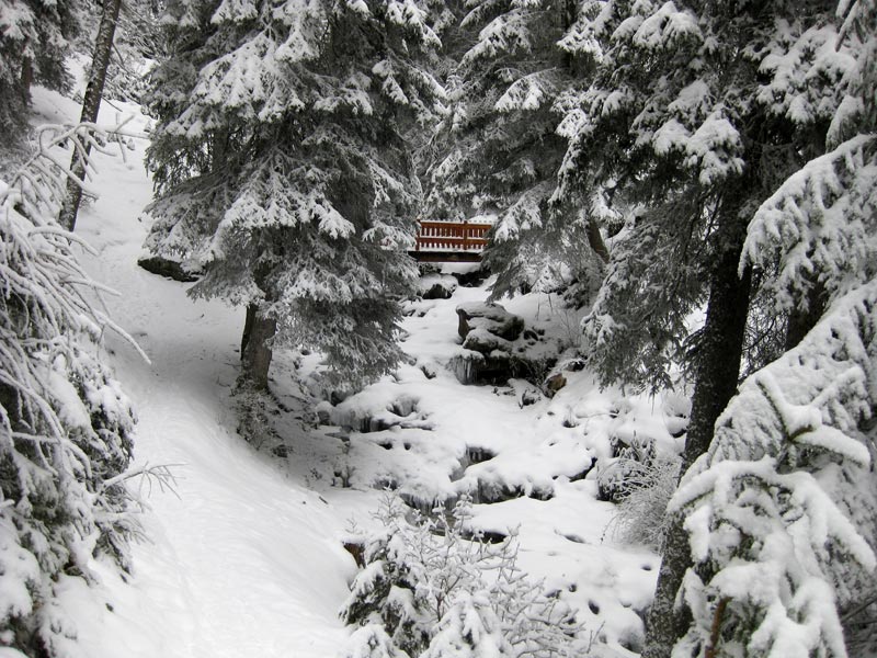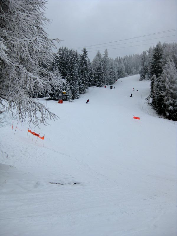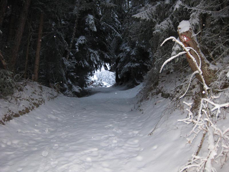 Nous avons parcouru le secteur de Pra Very, par une belle forêt de sapins couvert de neige, rejoignant la piste de Pravendus, jusqu’au village de Montalbert, noyé dans le brouillard. Malgré de beaux lampadaires, le village de grands chalets, paraissait assez artificiel. Nous retournions sans nous égarer, ce qui n’est pas évident, parmi les nombreux embranchements rencontrés. Après la traversée de la forêt, deux heures trente plus tard, nous arrivions dans la nuit à La Roche.