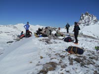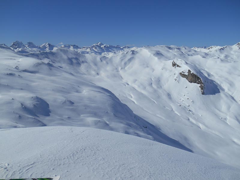 Nous descendons, remettons les peaux pour retrouver André à La Gradillère et nous repartons, par des passages délicats, entre les corniches, le vide et les rochers à fleur de neige.