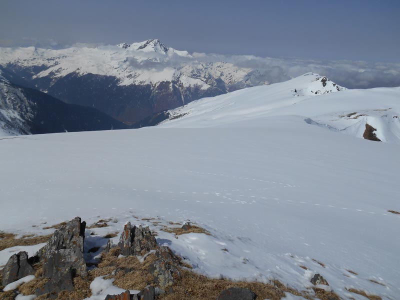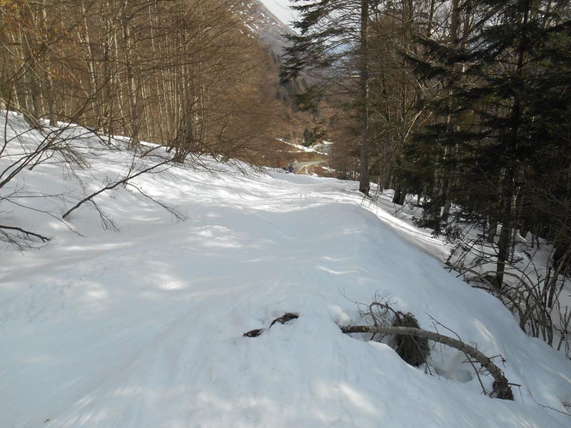 C'est à 9 h 20, que nous partons par la piste Jaune, avec quelques minutes de retard, dues à un problème technique. Le ciel se dégage de ses nuages et le soleil brille chaudement. Les couteaux peuvent être retirés, pour la descente sur les cabanes de Tramazaygues. Passés le petit pont sur l'Adour, nous remontons vers l'ouest.