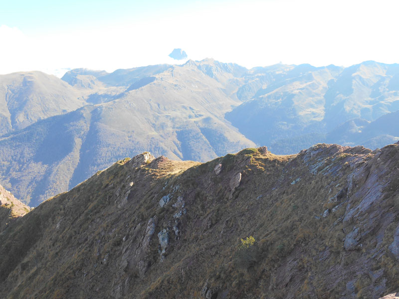 Le repas terminé, nous repartons dans la descente de la crête, puis la remontée pour gagner Le Souperet, atteint à 12 h 30. La vue est identique, sauf que les sommets au sud et à l'ouest sont bouchés ! Nous dégringolons jusqu'au sentier d'Arlet et remontons au sud, au col d'Arrouy. Plus bas un isard court et s'arrête pour nous regarder.