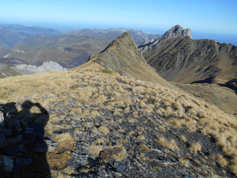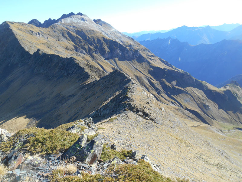 Je descends par la crête est, en à-pic au sud et parviens au col de Louesque. Je poursuis sur l'arête aérienne sur un terrain peu stable. Il est préférable de suivre le pierrier pentu, longeant les parois. Des cairns signalent un passage. Une cheminée conduit à une brèche. J'escalade quelques mètres la roche est friable . Je n'insiste pas.