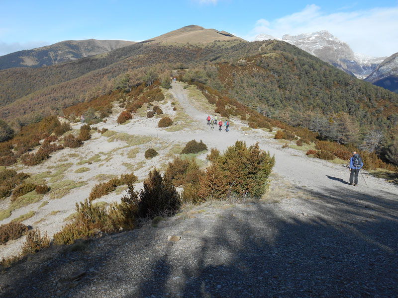 Nous cherchons à rejoindre la crête Laderas de Forcellos et El Romañon Pelao, au nord-est. Alors, couverts de voiles neigeux, surgissent les Peñas Espata, Retona, Collarada, Collaradeta. Nous suivons la longue et large crête vers le nord. Montées et descentes se succèdent de creux en bosses et petits sommets. A midi et demi, nous nous arrêtons pour déjeuner, profitant de la vue Peña de Oroël, Tozal de Guara, Peña Montañesa, Peña Telera, etc.