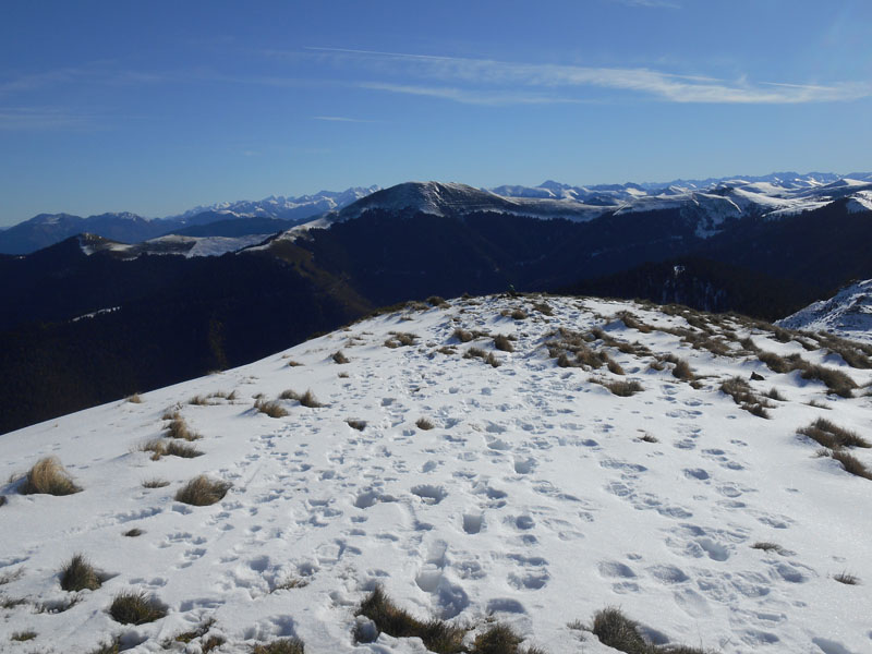 Une longue crête nous entraîne, à travers la neige gelée, mais peu épaisse. C'est ainsi qu'à 11 h10 nous atteignons le pic de Montaut. Ce belvédère présente une vue à 360 degrés qui laisse apparaître les cimes de l'Ariège,, de l'Espagne, comme les Encantats, l'Aneto,, la Montagne d'Areng, les pics du Portillon, le pic d'Aret, l'Arbizon, le pic du Midi de Bigorre, le Casque du Lhéris, etc.