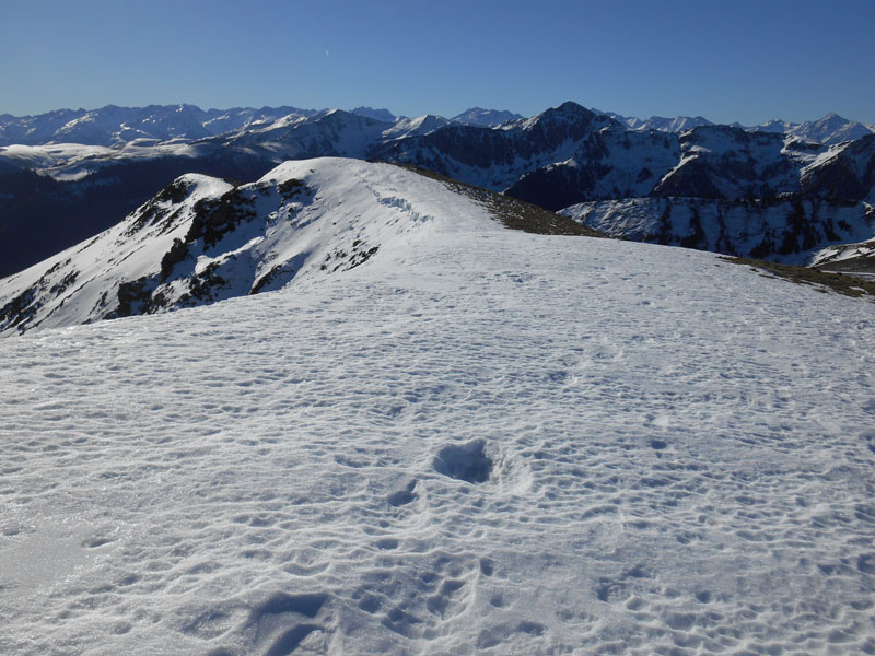 Continuant sur la crête nous montons au pic de Belloc. La vue est identique. La crête descend, puis remonte une pente raide couverte de plaques de neige glacées, mais aussi de bruyères qui nous permet d'avancer sans glisser.