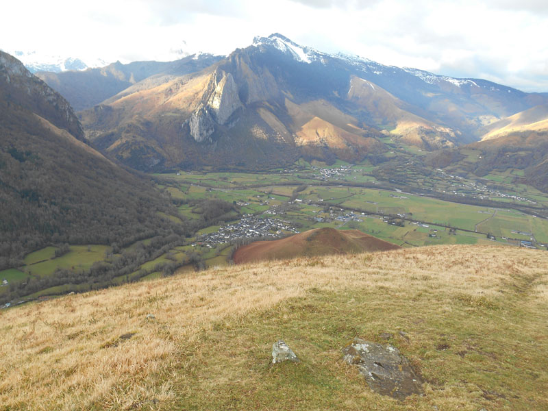 Coté vallée, nous distinguons les villages d'Aydious, Jouers, Accous. Au nord ouest, le pic de Layens sort des nuages, tandis que le pic de Bergon, de son grand chapeau, cache son sommet. Une forte pente nous entraîne sur la crête de Bergout. Nous la suivons, abordant des bosses plus ou moins hautes, dont une dominant à 1650 m.
