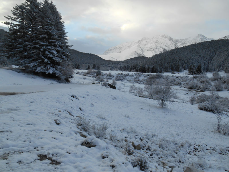 9 h 45, nous suivons la route enneigée, en direction de l'ouest, qui longe la forêt du Différend et le secteur Sarrat de l'Artigou. Les sapins, parés de fils soyeux de neige et de voiles blancs, laissent tomber leurs branches, en guise de salut. Le soleil projette ses rayons sur les pentes est, ainsi que sur les eaux scintillantes du ruisseau.